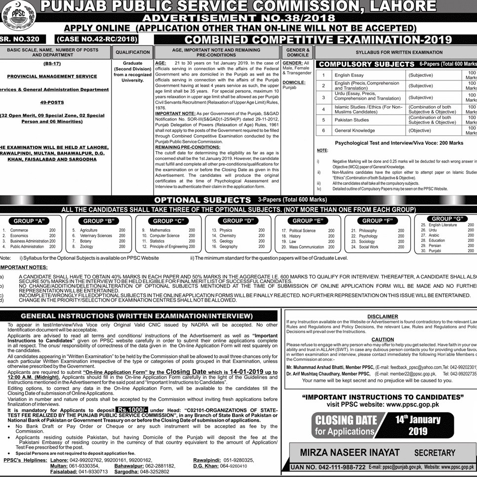 PPSC has announced PMS 2019 Combined Competitive Exam Punjab. Advertisement has been be published by PPSC for CCE of 49 Posts of Provincial Management Services for recruitment on the posts of Assistant Commissioner, Sections Officers in Consolidated Advertisement 38/2018.