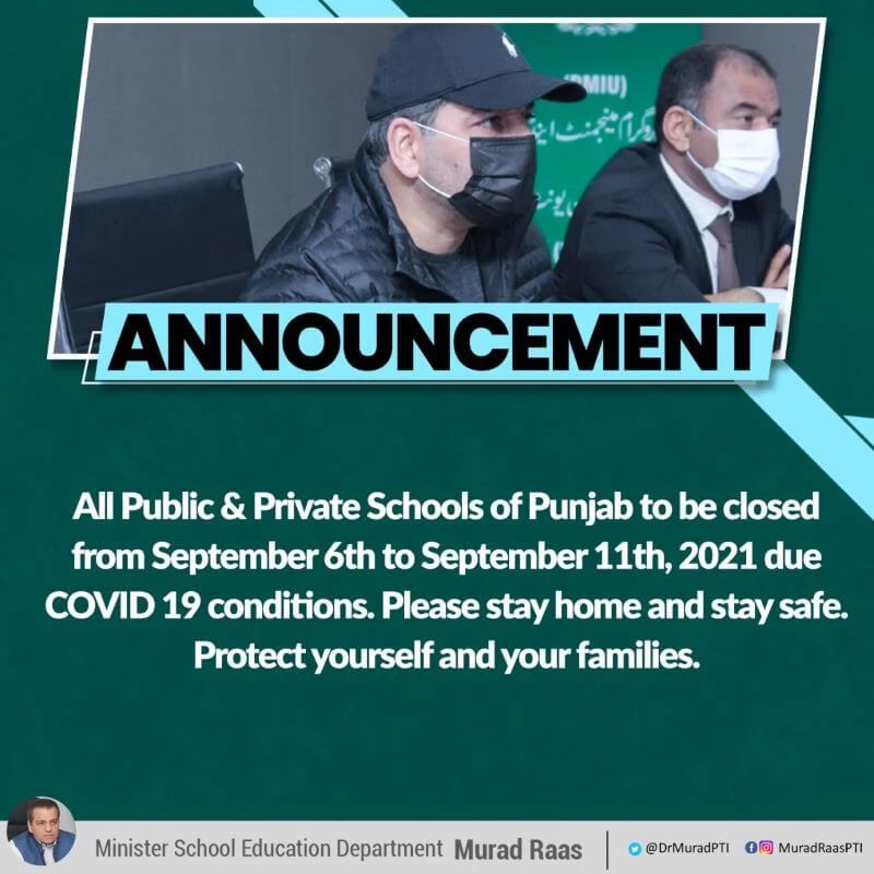 Punjab Government has announced to close all Public and Private schools in the province for one week. Schools shall be closed from September 6 to September 11, 2021, due to COVID-19 conditions. 4th Wave of coronavirus is on the rise and new restrictions are imposed.
